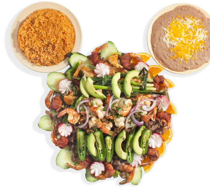 Indulge in the Botana, a festive family platter overflowing with flavor! Savor the rich taste of bacon-wrapped and garlic shrimp, and the perfectly char-grilled carne asada and chicken. This feast sits atop a fresh garden of crisp lettuce, vibrant veggies, and sweet citrus. Complete your meal with sides of traditional Mexican rice and creamy, cheesy refried beans, and create your own delicious tacos with your choice of tortillas. It's a colorful and satisfying experience that's sure to delight!